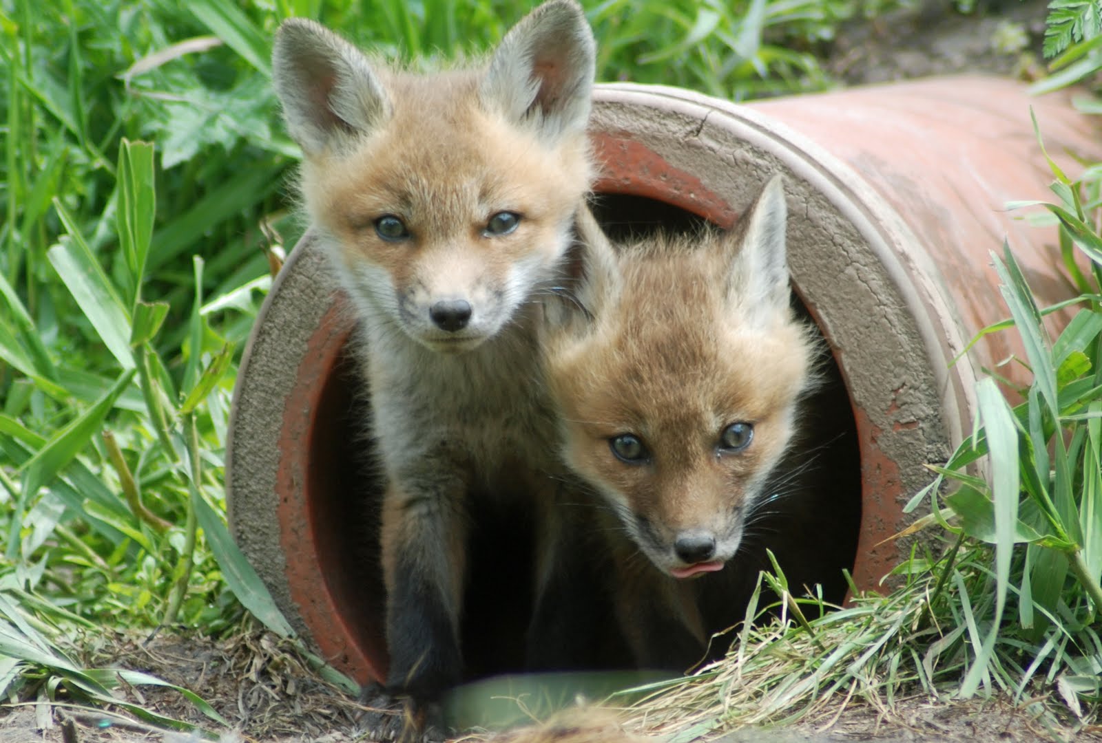 Curious and rambunctious Red Fox kits can be watched playing at their den – so cute! Foxes den in abandoned groundhog holes or in holes dug by adults on sandy slopes. Dens may be used and discretely observed for many years. Kits emerge from dens when they are about a month old. The female stays with the kits, putting up with kit antics, for about a month while the male does the hunting.