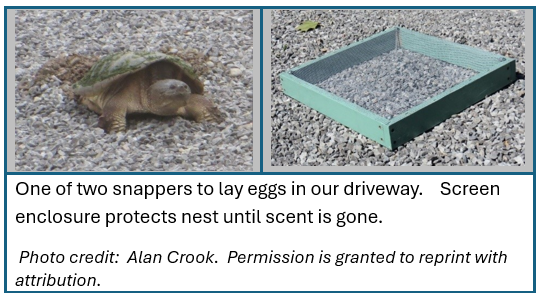 - Baby turtles are hatching. Look for shallow pits in gravely areas near water, and you may find the discarded eggshells. Four years ago at Step Outside, we covered our own Snapping Turtle nests with chickenwire screens, and they hatched around the first of the month. We thought all but 4 baby turtles managed to get out of the enclosure, but further digging found 16 more struggling to get out of tightly-packed sand and gravel above a layer of eggshells. Perhaps recent, hard rains had collapsed the nest cavity and trapped the babies. Fifteen survived to join their brethren in the lake, courtesy of a first-class bucket ride. In previous years, they had been dug up by Skunks, Coyotes or coydogs earlier in the summer. Bad for the snappers, good for the Coyote pups. This year, we had one painted turtle dig a nest in the lawn near our driveway. It's covered too and we await the babies. They may possibly overwinter.