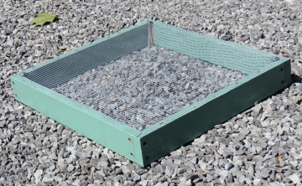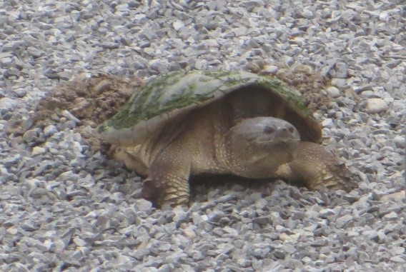 tortues serpentines avec des cagettes faites de métal et les tortues ont éclos vers le premier du mois. Nous pensions que tous les bébés tortus sauf 4 avaient réussi à sortir de l'enceinte, mais des fouilles plus poussées ont révélé que 16 autres avaient du mal à sortir du sable et du gravier serrés au-dessus d'une couche de coquilles d'œufs. Peut-être que de fortes pluies récentes aient effondré la cavité du nid et piégé les bébés. Quinze ont survécu pour rejoindre leurs frères dans le lac, grâce à une balade en seau. Cette année, une tortue peinte a creusé un nid dans la pelouse près de notre entrée. Tous les nids ont été recouverts et nous attendons les bébés. Il est possible qu'ils passent l'hiver.